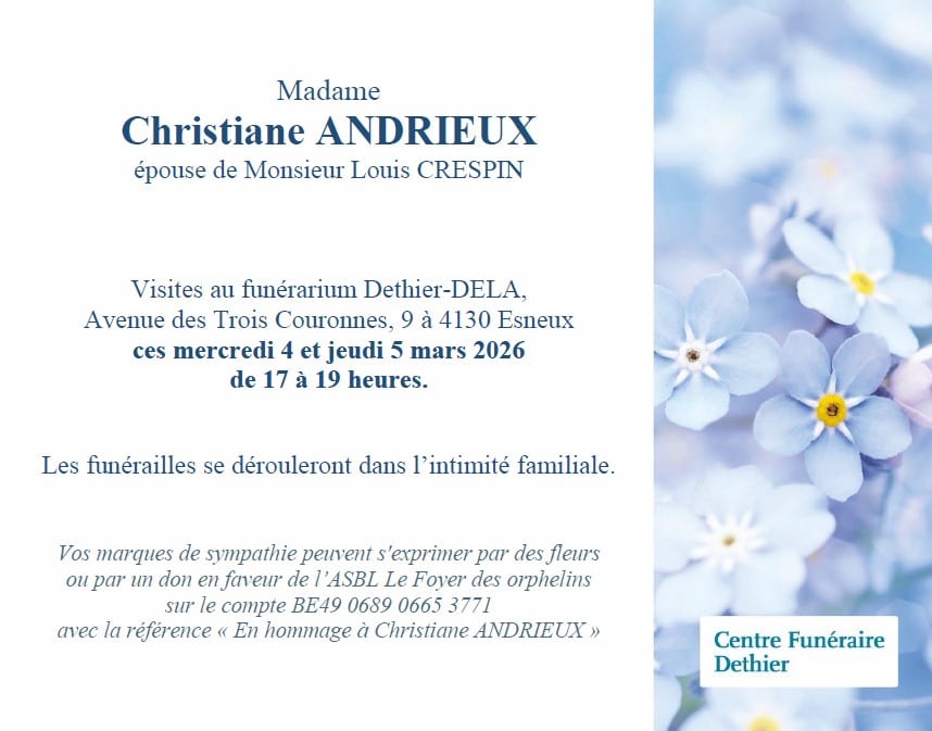 Nous vous annonçons avec tristesse le décès de notre membre Christiane Andrieux.
