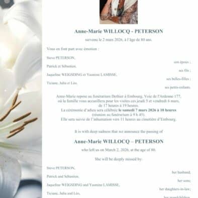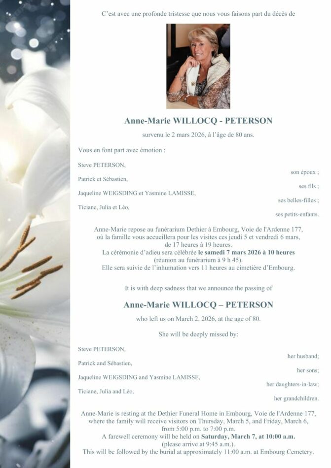 Nous avons la tristesse de vous annoncer le décès de notre membre Anne-Marie Peterson, épouse de Steve Peterson.