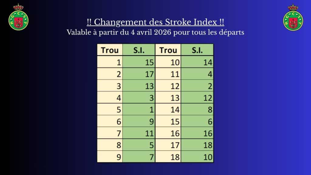 Comme annoncé lors de l’Assemblée générale, les stroke index (difficultés) des trous ont été adaptés afin d’être plus cohérents avec la réalité de notre parcours pour entrer en vigueur à partir du 4 avril 2026.